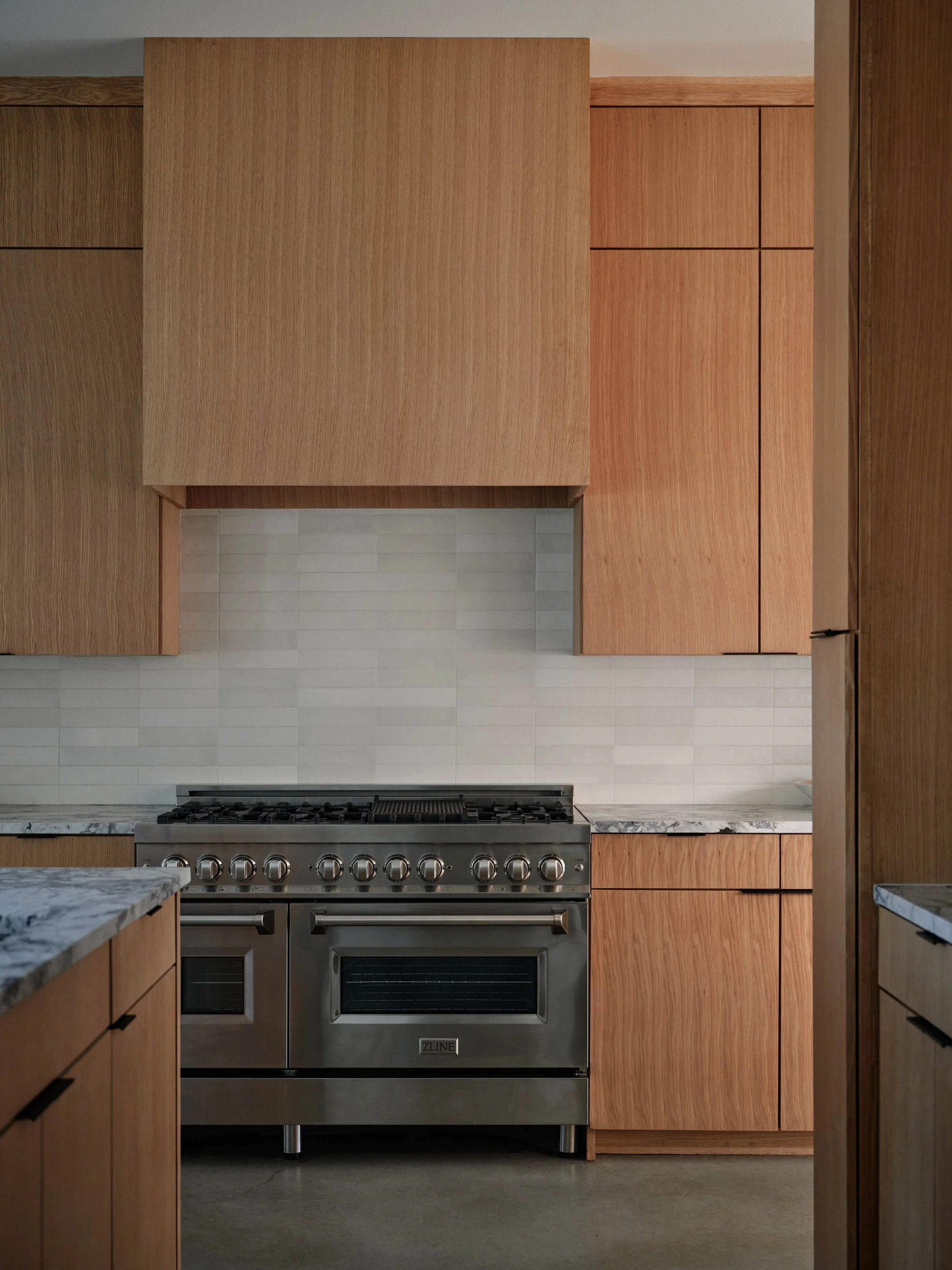A guest being welcomed inside the home first enters into a formal entry room with stair landing and sitting area, but rather than being segmented out into different spaces this contemporary take removes all the walls. This lets the high ceilings and large banks of windows fill the open and airy space with light and views to the street and the canopies of mature trees. The sitting area flows into the dining area with no walls, but a hanging light fixture and wood planked wall give the dining area a sense of separateness but openness. As you move towards the rear of the house is where the home shifts from public to private spaces. A large enclosed pantry acts as a privacy screen for the kitchen and hearth room which open to the backyard and rear patio rather than the street. Warm muted tones and natural oak cabinets characterize this space. The island acts as the focal point for family or friends while the kitchen and fireplace provide a backdrop on either side for cooking or relaxing.